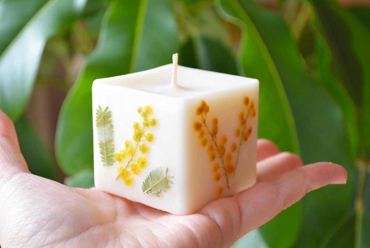 写真のミモザキャンドルは動画レッスン「押し花キャンドル」の応用になっています☺️💕とっても可愛いのでぜひこちらも作っていただけると嬉しいです!