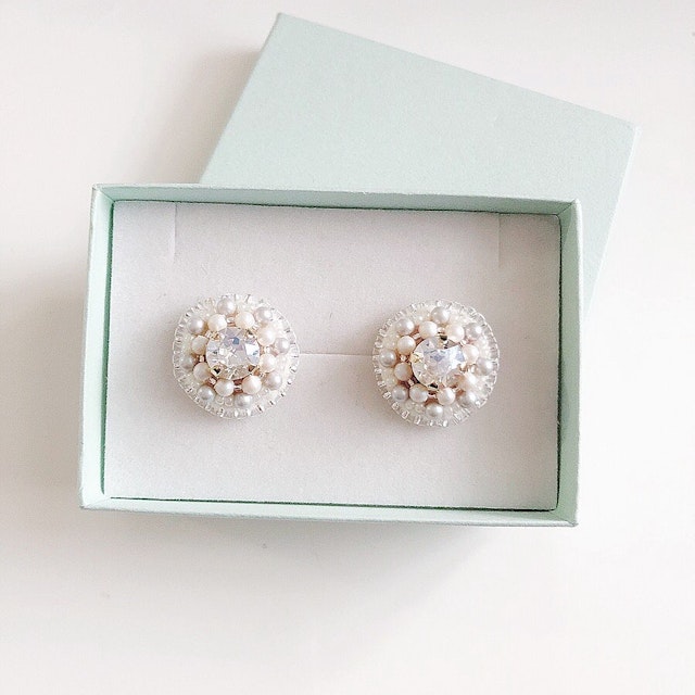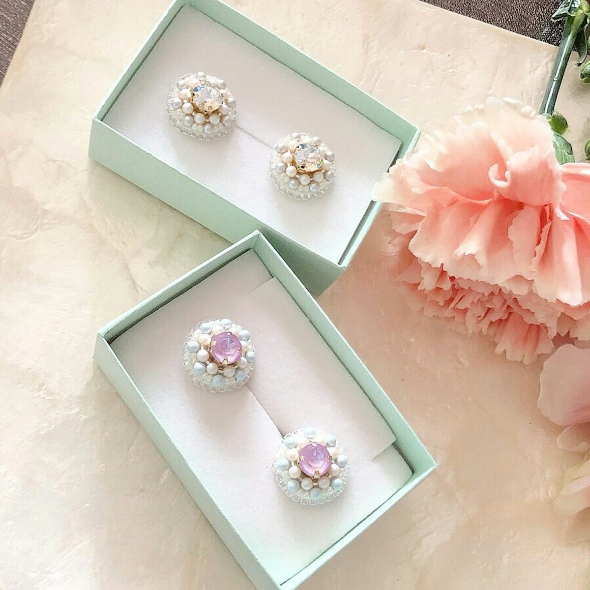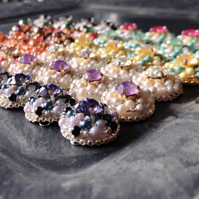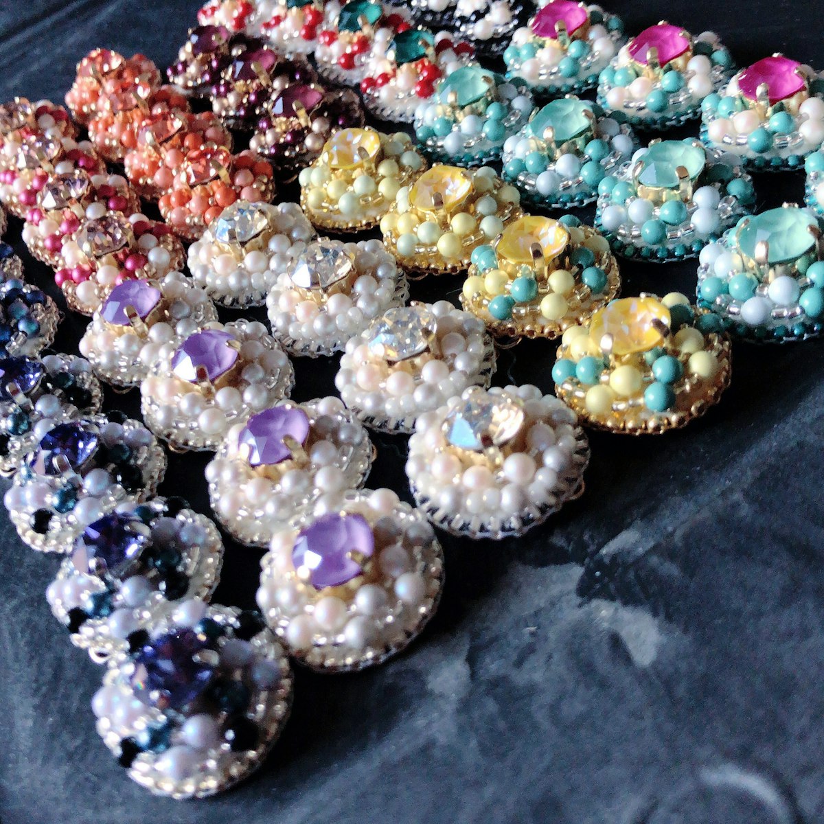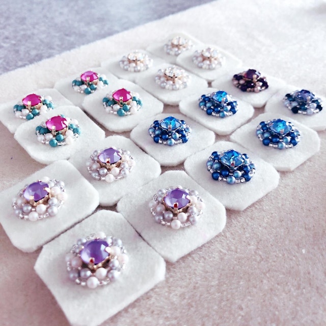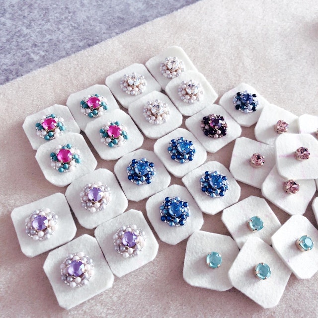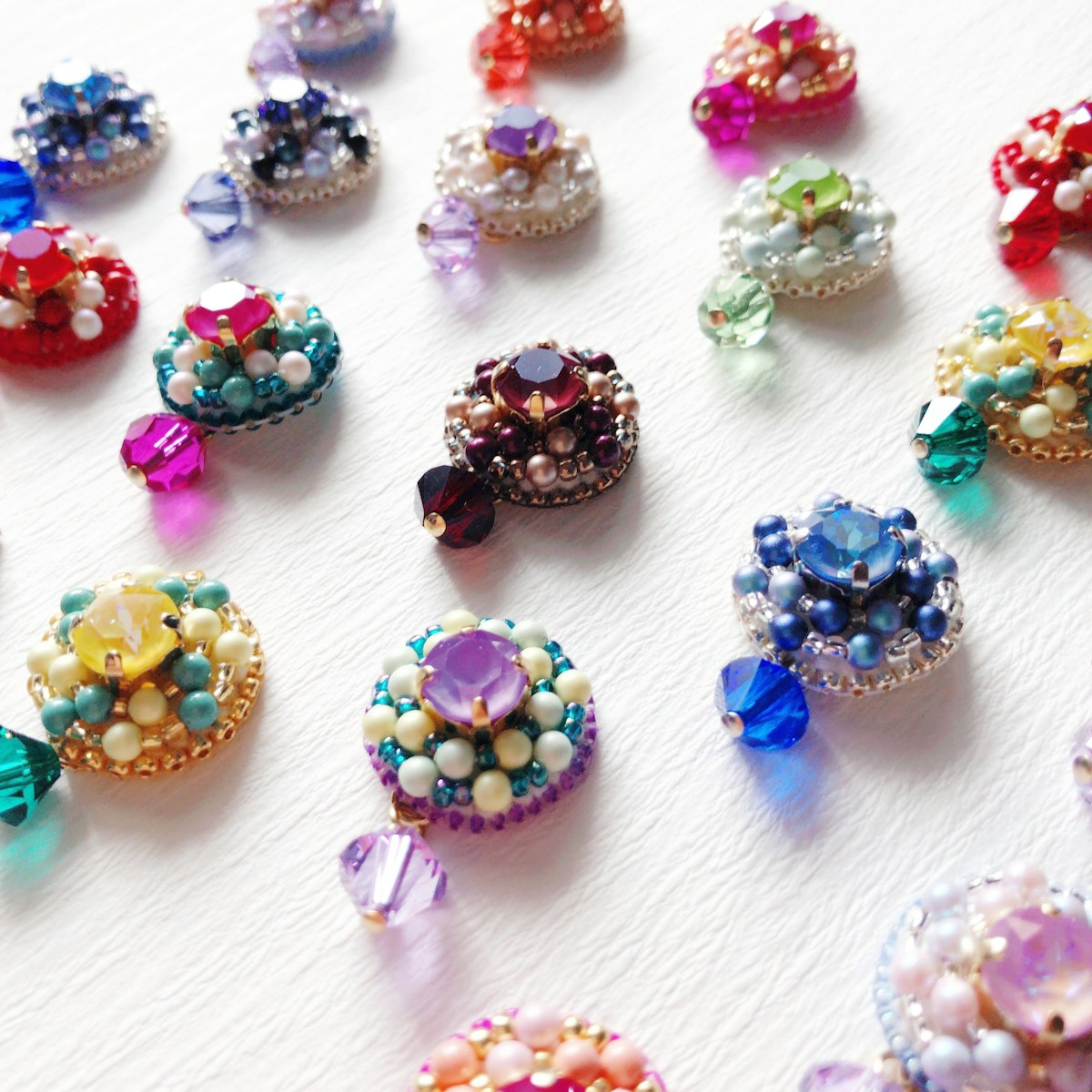 ビーズ刺繍の作品をメインにフックタイプに加工し、ピアスとイヤリングを納品予定です。