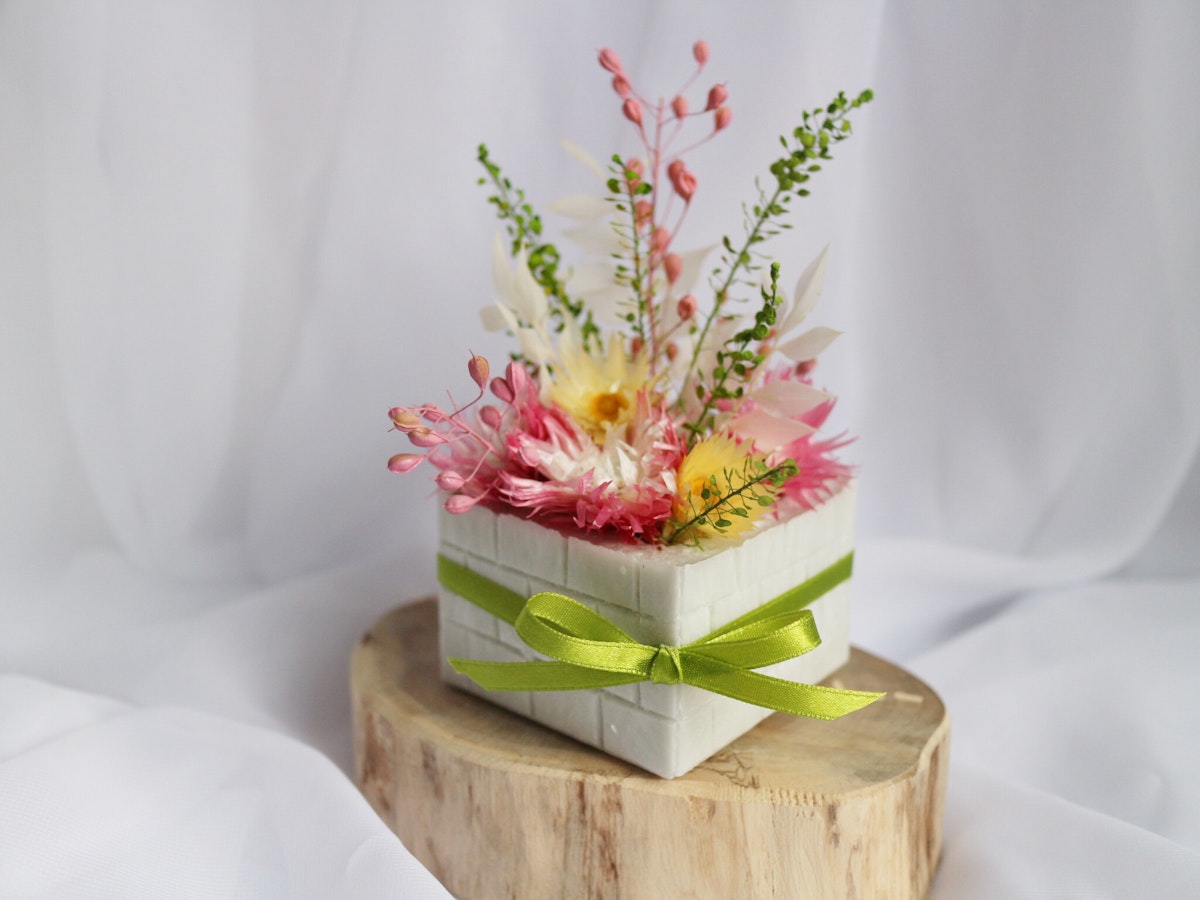 レンガ風のBoxの中に、お花を入れた香りを楽しむ灯さないキャンドルです。