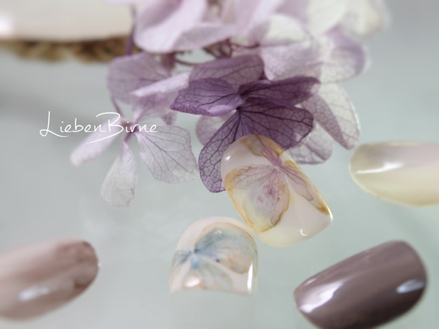 本日SNSでご紹介いたしました【雪とアジサイ】。こちらはリアルなフラワーアートが印象的な『紫陽花petals』の応用デザインです♪