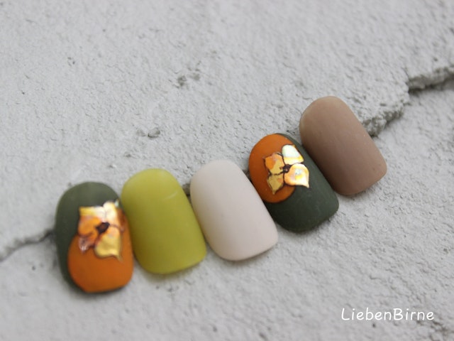 シックで落ち着いた印象の柿アート。マットな中にキラリと光るメタリックな葉っぱがおしゃれ♪伝統工芸の螺鈿をイメージし、風情ある仕上がりを意識しました★