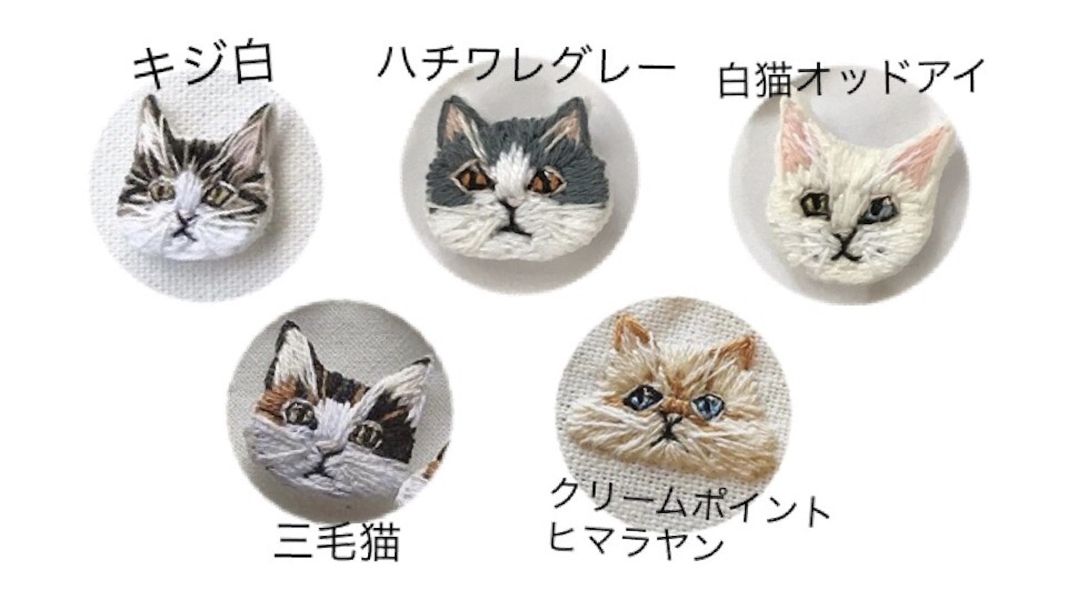 猫の顔の下にお花刺繍やストーンを縫い付けたオリジナルモチーフと、インスパイアしたビジューのペアのピアスとなります。