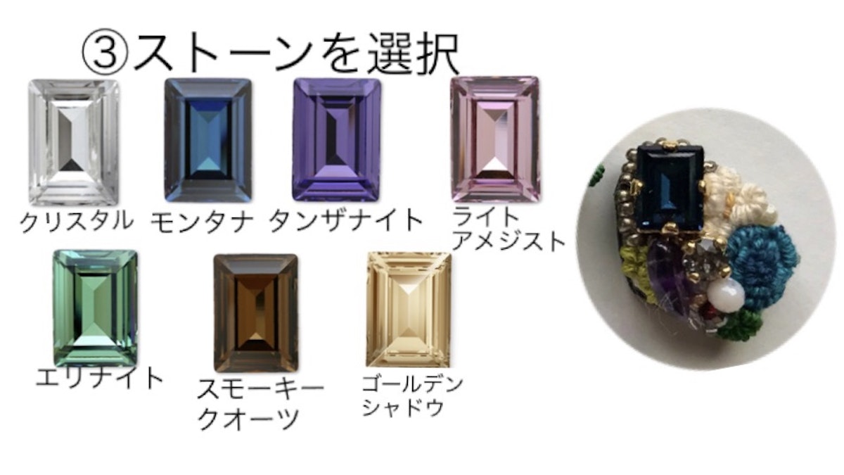 素材:刺繍糸、スワロフスキー、天然石、アクリルビーズ