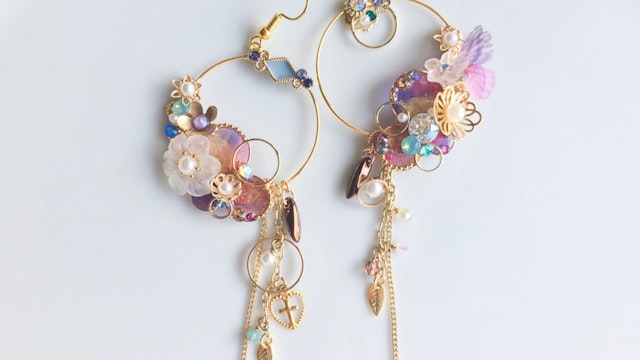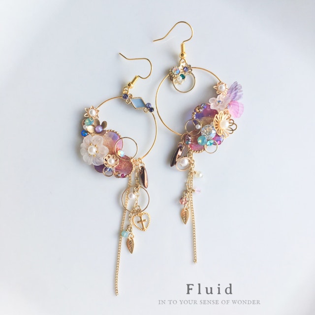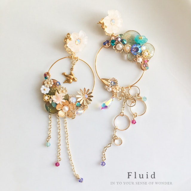ふんわりとした透明感が美しいフラワーパーツやスパンコール、ヴィンテージパーツを使用しています。