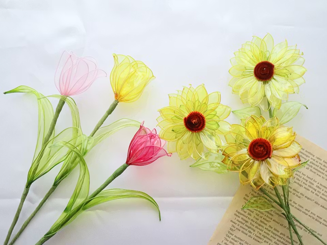 ワイヤーと樹脂で花びらを形作る工程を解説。