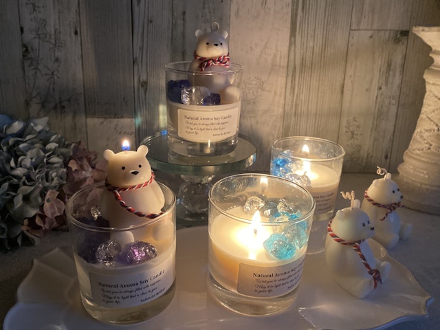 今回は北極のシロクマさんをイメージして作りましたが、クマやアロマソイキャンドルを色付けするとまた雰囲気が変わって楽しめます。