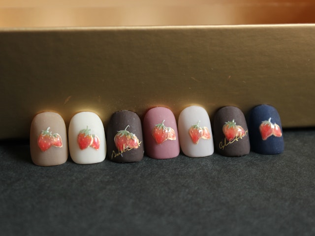 じわっとジューシーないちごアート。まるで本物のような質感ながらも、チラリと覗くメタリックが既製品のチャームのような印象に。チョコレート色ベースでバレンタインに。ホワイトベースで春アートに。紺色ベースで一年中。いつでも提案できる不動の人気モチーフです♪